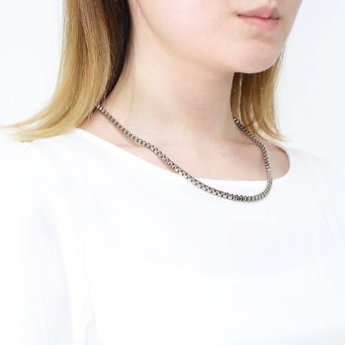 50cmの少し長めのサイズで、体格の良い男性の方にもお使いいただける男女兼用仕様です。なめらかに肌に沿うネックレスは、着け心地も抜群です。「カラダにやさしい!!」これだけのボリュームがあるのに、着けているのを感じさせないほど軽いのがうれしいです。