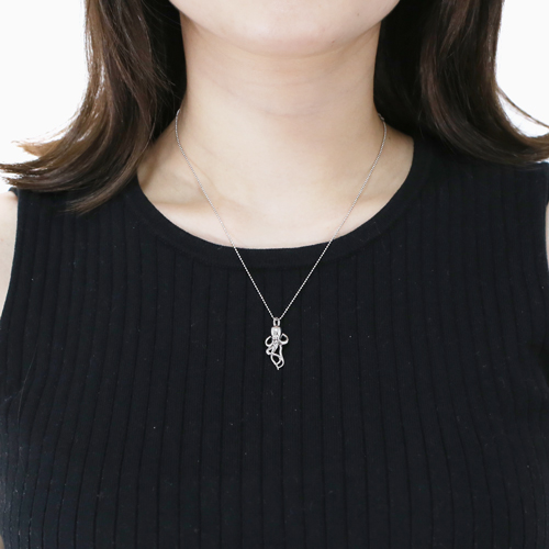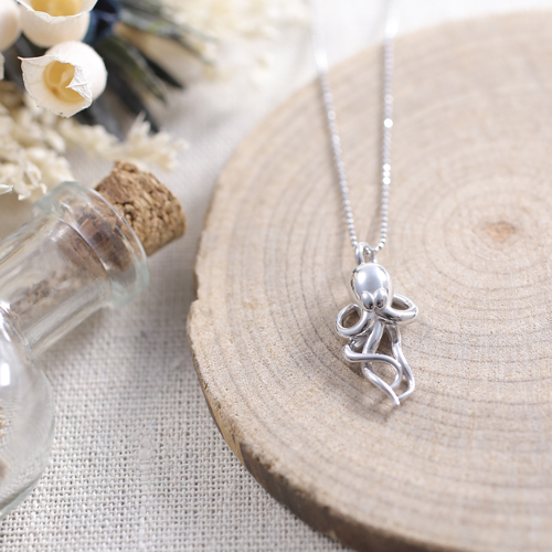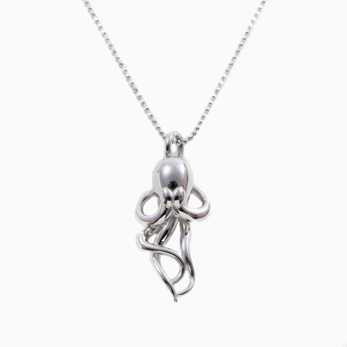 タコをモチーフした珍しいペンダント。古来からヨーロッパでは「悪魔の魚」と呼ばれ忌み嫌われてきました。タコは潜水夫を丸呑みにするなど、グロテスクに描かれる為に、逆に魔除けや守り神としても人気のモチーフです。意外とどんな服装にも合わせやすく、カジュアルはもちろん、オフィススタイルやフォーマルなスタイルに合わせて頂いてもユニークで素敵です。 また、シンプルチェーンやカラーストーンなど、お手持ちの繊細な一つ石ペンダントと重ね付けして頂いても素敵ですよ!印象の違う、華やかなペンダントとしてお使い頂けます。そのままつけても良し!他のペンダントと合わせれば、アレンジ次第でいろんな表情が楽しめる、毎日のお洒落に大活躍すること間違いなしのペンダントです!タコとチェーンをつなぐ、バチカン部分には、「925」の刻印が施されており、シンプルでありながら、見えない部分にも手の込んだ、こだわりを感じます。