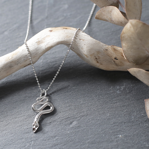 へびをモチーフした珍しいペンダント。古来からヨーロッパでは魔除けや守り神として崇められてきました。エジプトの古代遺跡などにも多く描かれており、人気のモチーフです。意外とどんな服装にも合わせやすく、カジュアルはもちろん、オフィススタイルやフォーマルなスタイルに合わせて頂いてもユニークで素敵です。 また、シンプルチェーンやカラーストーンなど、お手持ちの繊細な一つ石ペンダントと重ね付けして頂いても素敵ですよ!印象の違う、華やかなペンダントとしてお使い頂けます。そのままつけても良し!他のペンダントと合わせれば、アレンジ次第でいろんな表情が楽しめる、毎日のお洒落に大活躍すること間違いなしのペンダントです!トップとチェーンをつなぐ、バチカン部分には、「925」の刻印が施されており、シンプルでありながら、見えない部分にも手の込んだ、こだわりを感じます。