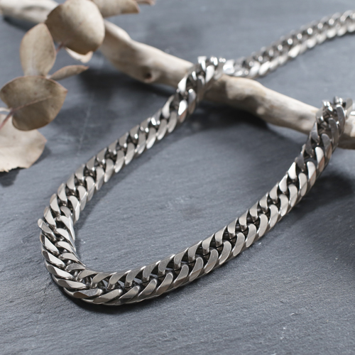 上品で飽きのこない6面カットダブル喜平。12mm幅の極太サイズで存在感があり、特に男性の方に楽しんでいただける洗練されたデザインです。