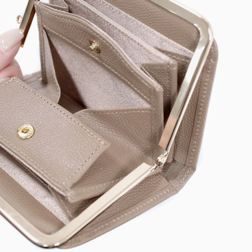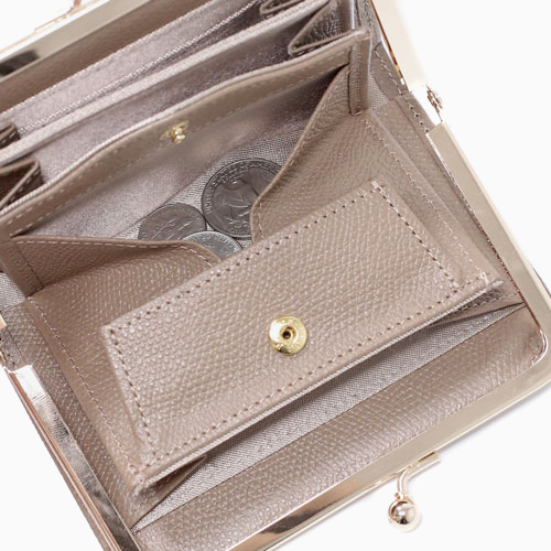 オシャレに高級感のある女性に人気のがま口式。少し大き目の長財布は、収納性にも優れています。自分へのご褒美にもおススメです。牛革を使用したオシャレながま口財布。いつまでも永く使いたくなるようなデザイン。小さめのバッグにも入れられる、丁度いい大きさでありながら、中のボタン式小銭入れは口が大きく開くので、取り出しやすくなっています。フリーポケットも3ポケットあり、お守りを入れるのも良いですね。金具部分にゴールドカラーを合わせた、女性らしいエレガントなデザインでご用意いたしました。
