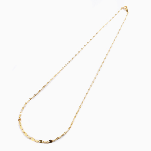 最高級素材である、純金(K24)を惜しみなく使用した、気品あふれるネックレス。華やか過ぎない、洗練されたデザインのネックレスは、落ち着いた大人の女性にぴったりです。普段の装いをぐっとエレガントに引き立ててくれます。42cmの胸元に余裕を持たせたサイズで、首筋より胸元にかけて徐々に太くしたグラデーション仕様ですので価格以上のボリューム感を演出しています。 また、プレート部分には「K24(刻印)」が有り、素材と品質も証明されています。バイシクル・ペダルをイメージしたデザインを縦と横に交互に連ねてより立体感を出しています。