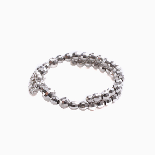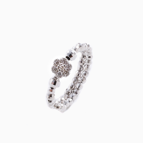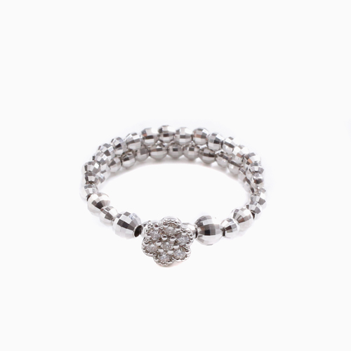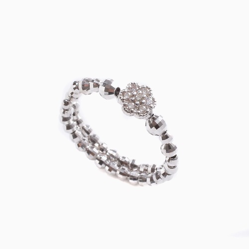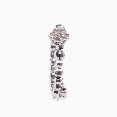 18金ホワイトゴールドを使用した、おしゃれで洗練されたフラワーモチーフのフリーサイズリング。ミラーボール部分に形状記憶ワイヤーをセットしていますので、瞬時にサイズ6~18まで調整可能です。どの指にも対応OK。プレゼントにもお勧めです。