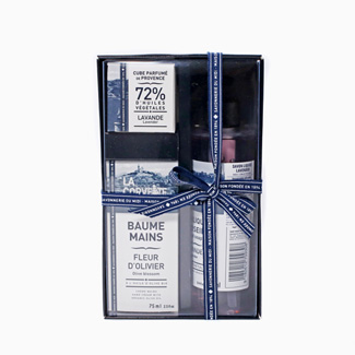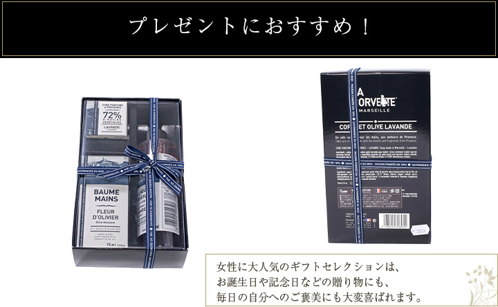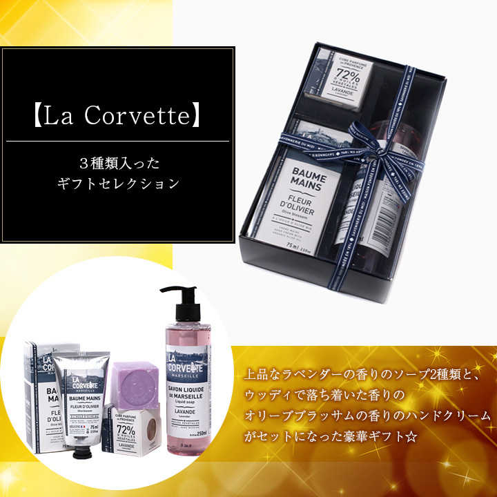 オリーブオイルを運んでいた船の名称を由来にもつラ・コルベットは、本物のマルセイユソープ「サボン・ド・マルセイユ」を作り続けて120年以上の歴史を重ねてきたSavonnerie du Midi(サボネリー・デュ・ミディ社)が展開するナチュラル&オーガニック ライフスタイルブランド。大釜でオリーブオイルを焚き上げる伝統製法を守りながら、今もなお、世界中にマルセイユソープの魅力を発信しています。古くから南フランスのプロヴァンス地方の名産品として有名なラベンダーのソリッドソープとリキッドソープ、さらにオーガニック由来のオリーブオイルやシアバターなどを配合したハンドクリームを詰め合わせた、上品で高級なギフトセレクションです。