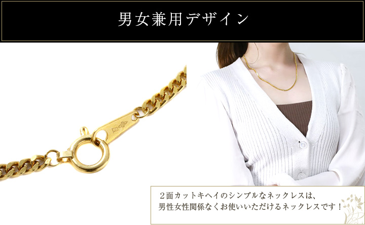 ピュアーゴールド純金の太目の2面カットキヘイが登場しました。上下にカットを施した上品でシンプル・飽きのこないデザインは控え目ながら圧倒的な存在感の黄金の山吹色。しかも、世界的に金の価格が高い現在、資産価値もあり、見た目の繊細な幅のわりにずっしりとした5.4gの重量感を感じてください。ペンダントトップ用としてもちょうど良い幅と50cmの長さ。もちろんそのままでも、人とは違った黄金の色合いが何気ないおしゃれを演出します。男性の方にもお着けいただける男女兼用デザインは、ペアーででも永遠の黄金の輝きを共有できるでしょう。24金を18g以上も使い、シンプルで年齢問わずいつまでもお使いいただけるチェーンは大変買い得です。フォーマルの席はもちろん、シンプルで使いやすいデザインは普段のおしゃれにも最適!ひとつ持っていればとても安心。特別な時のために揃えておきたい黄金ジュエリーです☆当店の商品は、全て、ひとつひとつ厳しい検品、チェックを通過していますので、どうぞご安心ください。男性の方にも抵抗なく着けてもらえるデザインのキヘイチェーン。ペアーで持たれてもおしゃれです。