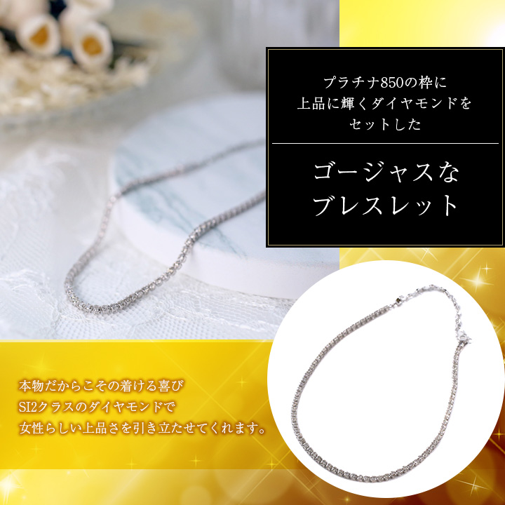 高級素材のプラチナ850を枠に、SI2クラスのダイヤモンドを合計1カラットも使用したゴージャスで上品なブレスレット。マグネット・スライド式の留具になっており、最長23cm~最短15cmまで長さを調節できます。忙しい朝でも簡単に装着でき、毎日つけたくなるアイテム!特別な日のジュエリーから毎日のお洒落ジュエリーまで幅広いコーディネートで大活躍間違いなしのブレスレットです☆