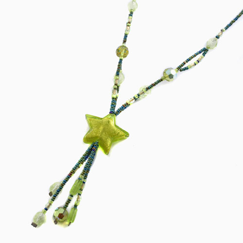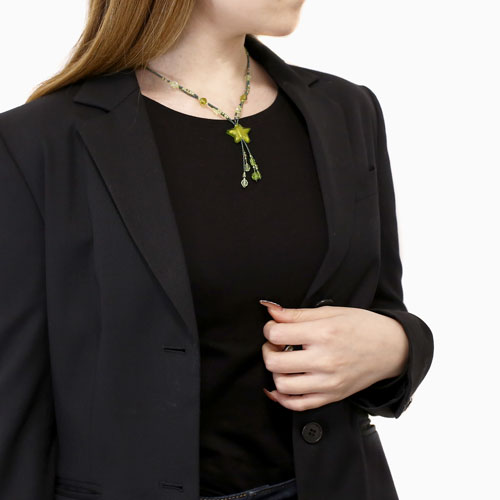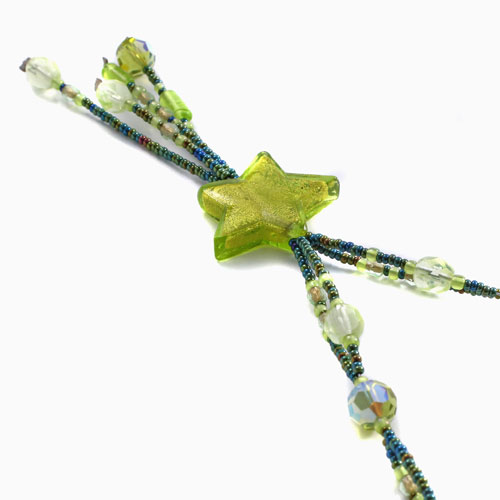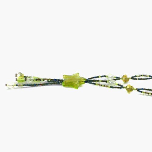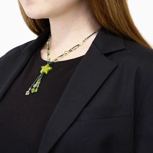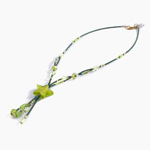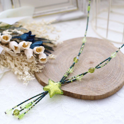 世界的に人気のYタイプチェーンをグリーン系のかわいい色合いとバランスで仕上げました。ベネチアンガラス、合金、樹脂を絶妙なバランスで使い、ボリューム感と軽い着け心地を実現。 これからの季節、プレゼントにもぴったりですよ。