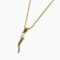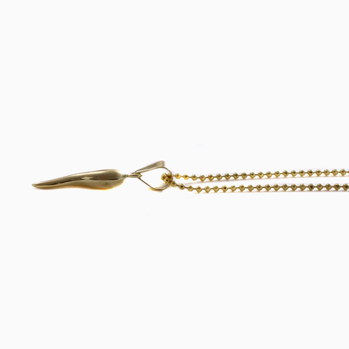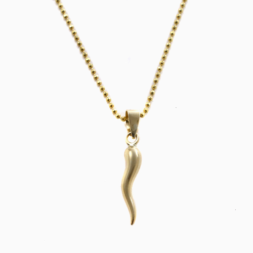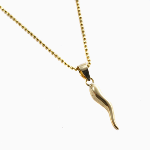 幸運を呼ぶコルノ(唐辛子)モチーフのペンダントはお守りとしても人気があり、胸元をユニークに演出します。チェーンは人気のSVカットボールをサービスでお付けしております。(トップとのゴールド色が若干異なります。気になるようでしたら、別売りのK18チェーンなどををお選びください。)