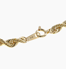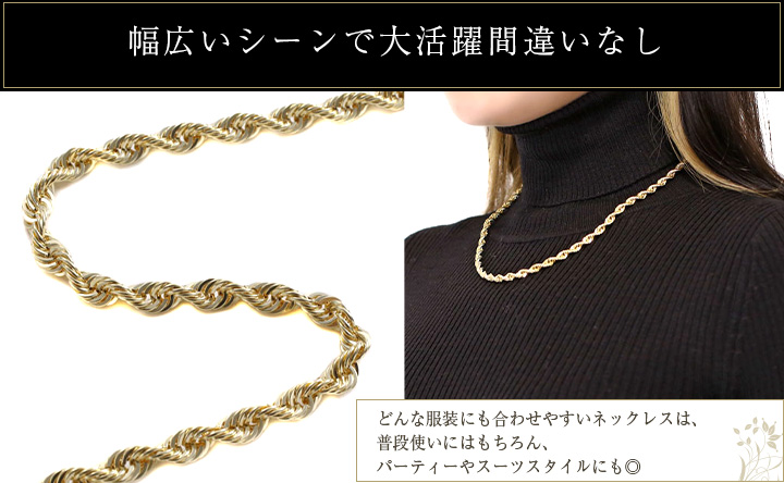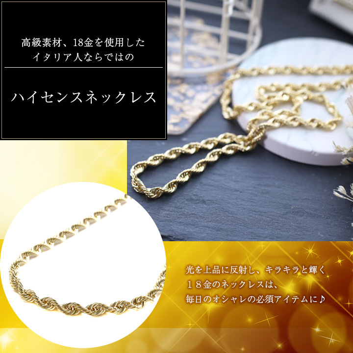 高価な18金ゴールドをたっぷりと使用し、イタリアンデザインの評判の高い高品質、中空構造の18金ロープチェーンは大変お買い得です。