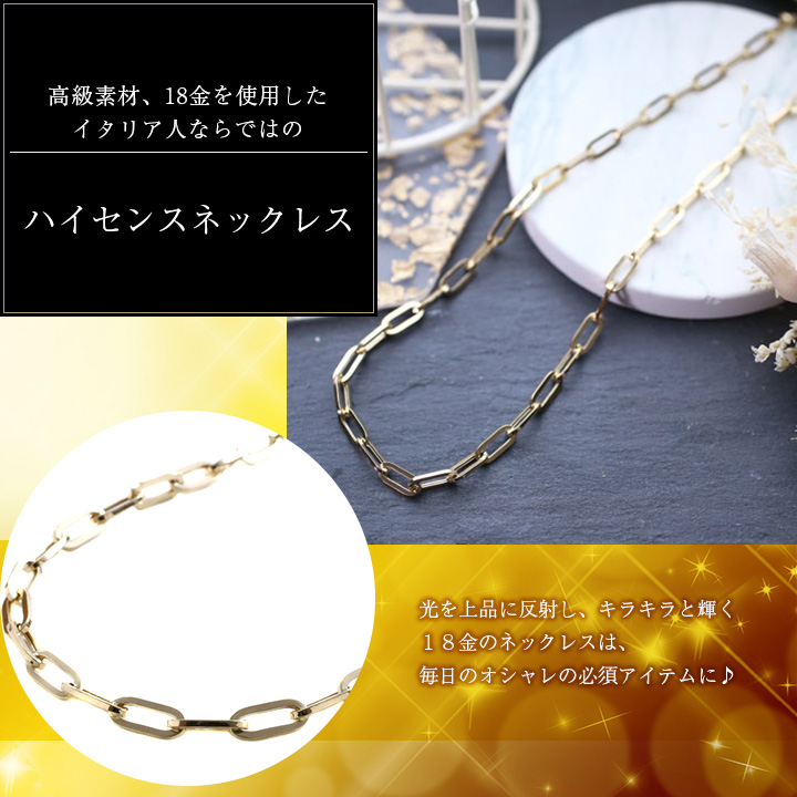 高級素材である、18金(K18)を惜しみなく使用した、有名ブランドC社が火をつけた世界的に人気のデザイン。繊細でシンプルなのに気品あふれるネックレス。イタリアならではの洗練されたデザインのペーパークリップネックレスは、落ち着いた大人の女性にぴったりです。普段の装いをぐっとエレガントに引き立ててくれます。50cmの首元にゆとりのあるサイズで、重ね着け用のチェーンとしてもお使いいただけます。プレート部分には、「K18(刻印)」が有り、素材と品質の良さも証明されています。日本製にはない細長いフラットなアズキタイプチェーンを組合わせたデザインはたくさんの輝く面を作り胸元を豪華に演出。高価な18金ゴールドをたっぷりと使用し、デザイン性にも評判の高い高品質ネックレスが大変お買い得です!!