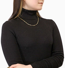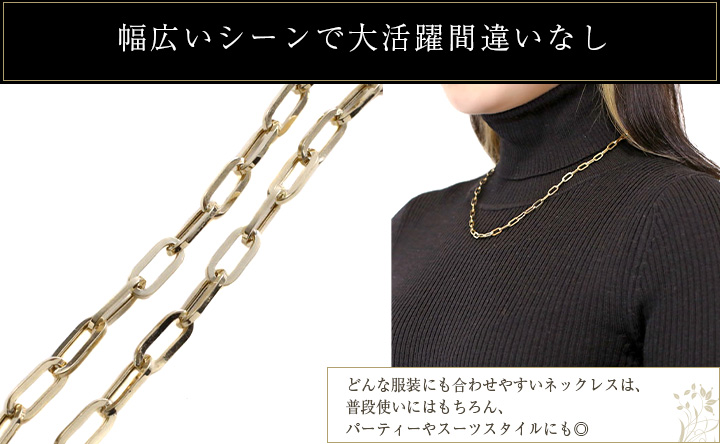 日本製にはない細長いフラットなアズキタイプチェーンを組合わせたデザインはたくさんの輝く面を作り胸元を豪華に演出。