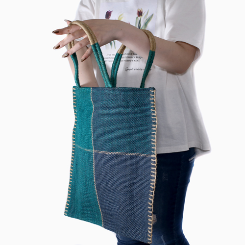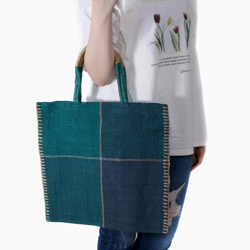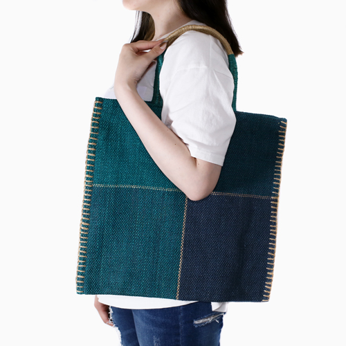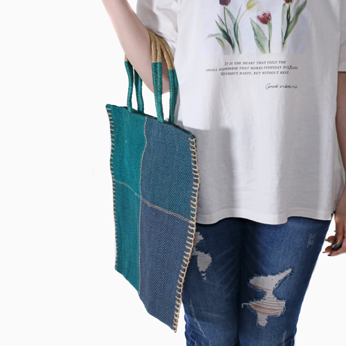 バングラデシュのNGO団体「タランゴ」が発展途上国の経済全体を活性させてる為、フェアトレードの一環として始めたハンドメイド製品。ジュートという高温多湿な環境で栽培される食物の繊維を原料として作られたトートバッグ。細かく丁寧に編み込まれ、手馴染みも良く、電車や人ごみでもあまり気にしなくていいのもうれしいです。A4サイズの大きさで荷物もたっぷり入ります♪色も鮮やかなグリーンとブルーの組み合わせで、大人っぽい雰囲気を醸し出してくれます。どんな服装にも合わせやすく、水着やビーチサンダルと組み合わせてもオシャレですのでリゾート地でも大活躍すること間違いなしです!!素材の性質上、海水の付着、衣類のひっかけ等には十分ご注意下さい。
