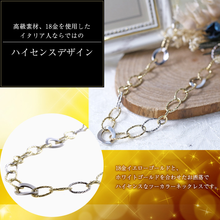 18金を贅沢に5.1gも使った豪華なツーカラーネックレス。18金イエローゴールドをメインに、ホワイトゴールドのパーツをセットした、イタリア人だからこその味わいを感じるデザインは、プレゼントにも大変人気のアクセサリーです。
