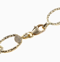 刻印入り引き輪近くのパーツに、素材と品質の証明をする刻印「750/ITALY」が刻まれています。 |