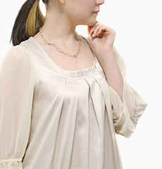 日本製にはない細長いフラットなアズキタイプチェーンを組合わせたデザインはたくさんの輝く面を作り胸元を豪華に演出。ゴドルナート風仕上げがよりキラキラ感を演出しています。また、スリーポイントにホワイトゴールドでアクセントを作りセンスの良さを作っています。