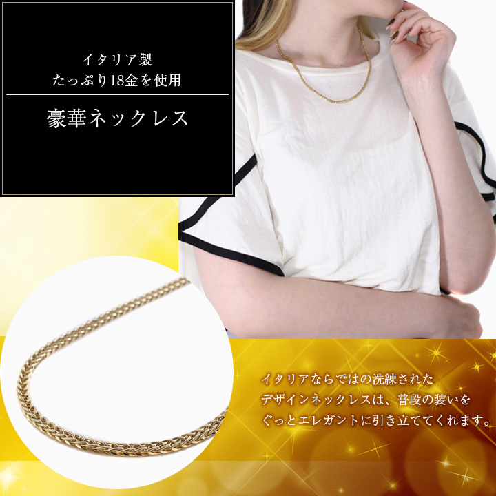高級素材である、18金(K18)を惜しみなく使用した、有名ブランドC社が火をつけた世界的に人気のデザイン。繊細でシンプルなのに気品あふれるネックレス。イタリアならではの洗練されたデザインのトリプルスピガ・ネックレスは、落ち着いた大人の女性にぴったりです。普段の装いをぐっとエレガントに引き立ててくれます。50cmの首元にゆとりのあるサイズで、重ね着け用のチェーンとしてもお使いいただけます。プレート部分には、「K18(刻印)」が有り、素材と品質の良さも証明されています。日本製にはないおしゃれなキヘイタイプチェーンを組合わせたデザインはたくさんの輝く面を作り胸元を豪華に演出。 高価な18金ゴールドをたっぷりと使用し、デザイン性にも評判の高い高品質ネックレスが大変お買い得です!!