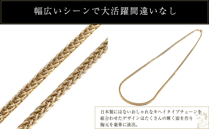 日本製にはないおしゃれなキヘイタイプチェーンを組合わせたデザインはたくさんの輝く面を作り胸元を豪華に演出。