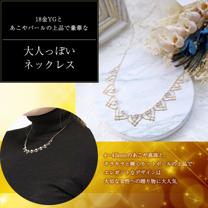 4~4.5mm あこやパールを使用した豪華仕様着ければその存在感はかなりのもの!!最高級の輝きが、首元をぱっと明るく大人の華やかさを演出してくれます。日本の自然の恵みが与えてくれた宝石、あこや真珠を使用。この価格からは考えられないお買得で価値のあるものです。チェーンには金属アレルギーを起こしにくいと言われている最高級素材、18金イエローゴールドのカットボールチェーンを使用!全ての素材にこだわったゴージャスなデザインネックレスは、年齢やファッションに左右される事がない華やかなアイテム。きっと、長く、大事にお使い頂けますよ。プレゼントにも最適です!!