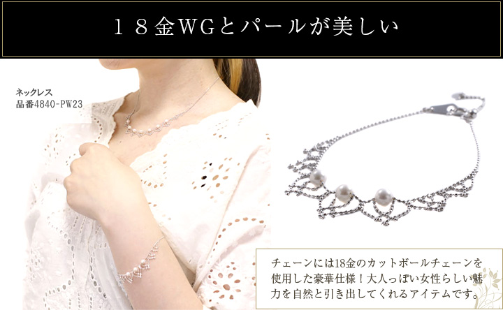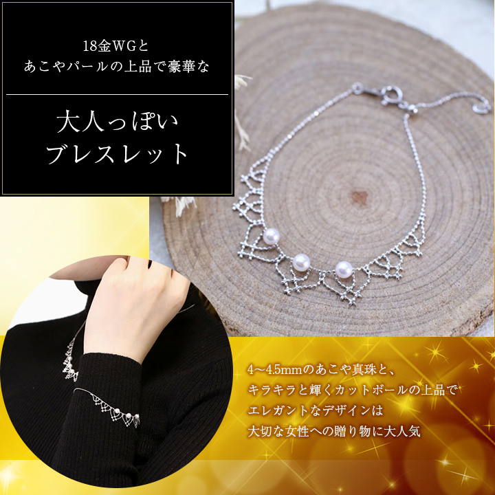 4~4.5mm あこやパールを使用した豪華仕様着ければその存在感はかなりのもの!!最高級の輝きが、手首をぱっと明るく大人の華やかさを演出してくれます。日本の自然の恵みが与えてくれた宝石、あこや真珠を使用。この価格からは考えられないお買得で価値のあるものです。チェーンには金属アレルギーを起こしにくいと言われている最高級素材、18金ホワイトゴールド カットボールチェーンを使用!全ての素材にこだわったゴージャスなデザインブレスレットは、年齢やファッションに左右される事がない華やかなアイテム。きっと、長く、大事にお使い頂けますよ。プレゼントにも最適です!!