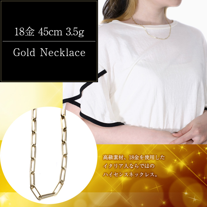 高級素材である、18金(K18)を惜しみなく使用した、有名ブランドC社が火をつけた世界的に人気のデザイン。繊細でシンプルなのに気品あふれるネックレス。イタリアならではの洗練されたデザインのペーパークリップネックレスは、落ち着いた大人の女性にぴったりです。普段の装いをぐっとエレガントに引き立ててくれます。45cmの首元にゆとりのあるサイズで、重ね着け用のチェーンとしてもお使いいただけます。プレート部分には、「750(刻印)」が有り、素材と品質の良さも証明されています。日本製にはない細長いフラットなアズキタイプチェーンを組合わせたデザインはたくさんの輝く面を作り胸元を豪華に演出。高価な18金ゴールドをたっぷりと使用し、デザイン性にも評判の高い高品質ネックレスが大変お買い得です!!