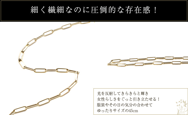 高級素材18金を3.5gも使用した上品で繊細なネックレス。45cmの長さは、女性のデコルテにナチュラルに沿い、美しく上品な大人っぽさを引き出してくれます。服装、年齢関係なくお使いいただけるネックレスはプレゼントにも◎