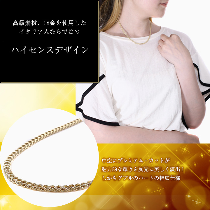 高級素材である、18金(K18)を使用したイタリアでは定番のデザインのパイプロープ。華やか過ぎない気品ある艶消し仕上げのデザイン。ボリュームがあるのに軽い着け心地が人気の秘密です。もちろんそのままでも、またお持ちの他のチェーンとのコーディネートと、普段の装いをぐっとエレガントに引き立ててくれます。ハートデザインをダブルにした、サイズ42cmのボリューム満点のパイプロープチェーンは、着け心地も抜群です。プレート部分には、「750(刻印)」が有り、素材と品質の良さも証明されています。