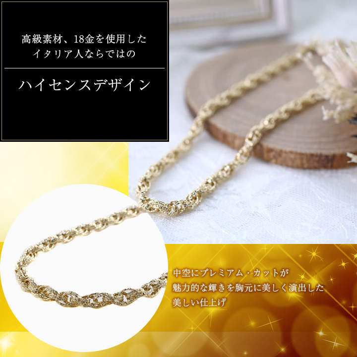 高級素材である、18金(K18)を使用したイタリアでは人気の中空デザイン。華やか過ぎない気品ある艶消し仕上げのデザイン。ボリュームがあるのに軽い着け心地が人気の秘密です。もちろんそのままでも、またお持ちの他のチェーンとのコーディネートと、普段の装いをぐっとエレガントに引き立ててくれます。シンプルな飽きの来ない、サイズ42cmのボリューム満点のホローチェーンは、着け心地も抜群です。プレート部分には、「750(刻印)」が有り、素材と品質の良さも証明されています。