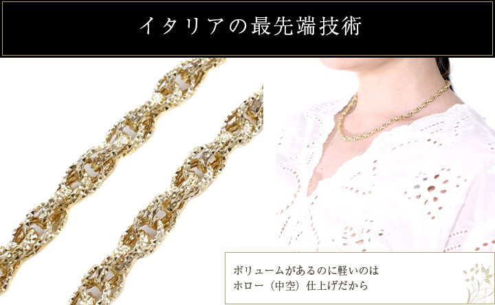 高級素材である、18金(K18)を使用したイタリアでは人気の中空デザイン。華やか過ぎない気品ある艶消し仕上げのデザイン。ボリュームがあるのに軽い着け心地が人気の秘密です。もちろんそのままでも、またお持ちの他のチェーンとのコーディネートと、普段の装いをぐっとエレガントに引き立ててくれます。