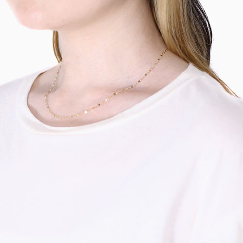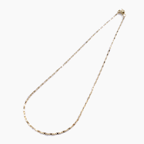 - 大変繊細なチェーンですので無理に引っ張ったり、重いものを上にのせたりすると不良になる恐れがありますのでご注意ください。ペンダント用のチェーンとしてのご使用はお勧めしません。