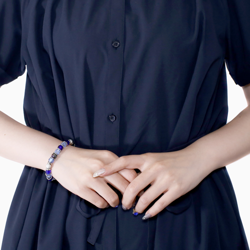 イタリア・ムラーノ島で、マエストロと呼ばれる熟練した職人たちが、べネチアンガラスの伝統の技法を用い一つ一つ丁寧に手作りしています。その美しい模様は、芸術品とまで称されるほど。手作りのため、まったく同じものは2つとなく、世界にたった一つのあなただけのブレスレットといえます。そのベネチアンガラスを使って、ミラノで人気の若手アクセサリーデザイナー・キアラ(CHIARA)がおしゃれでわくわくする感性のハンドアクセを作りました。ブルー系の大人っぽい色使いは日本の女性に気軽に着けてもらえるように考えたそうです。頑張った自分へのご褒美に、また記念日のプレゼントにもぴったりです。※職人による完全な手作りベネチアンガラスを使っていますので色合い、濃淡や配色がそれぞれ多少異なります。