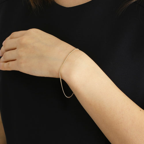 高級素材・18金(K18)を贅沢に使用した、細くてシンプルなのに存在感抜群のキヘイブレスレット。さり気ないおしゃれを手首に演出してくれます。リストウォッチやダイヤモンドのブレスレットなどとのコーディネートをお楽しみいただけます。どんな服装にも合わせやすく、カジュアルはもちろん、オフィススタイルやフォーマルなスタイルに合わせて頂いても素敵です!印象の違う、華やかなブレスレットとしてお使い頂けます。ブレスレットの留具部分には、「K18」刻印が施されており、18金ゴールドの純度を証明しています。