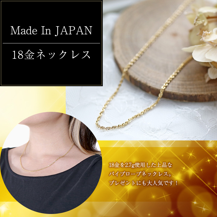 高級素材の18金を2.7g使った、中空仕様のパイプロープネックレス。パイプロープネックレスは軽く、長時間着けていても疲れにくく、一日中着けていられるので、毎日のオシャレにピッタリのアクセサリーです。オフィススタイルからドレスアップと幅広い服装お使いいただけます。