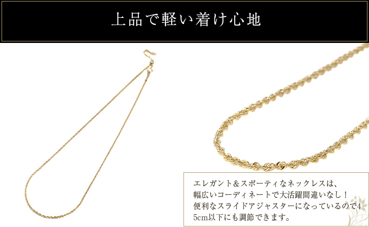 45cmのゆったりサイズのパイプロープチェーンは、着け心地も抜群です。