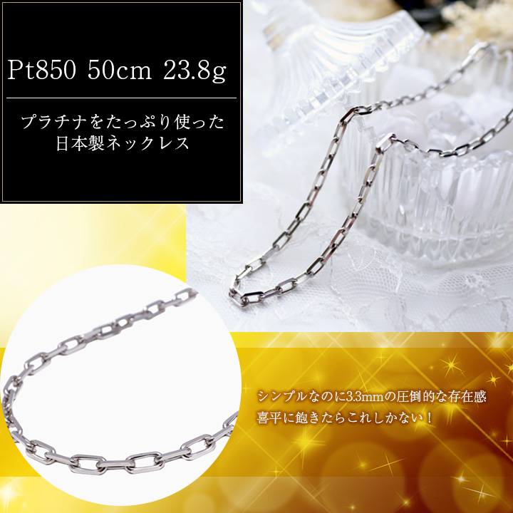 高級素材であるプラチナ850を惜しみなく20g以上も使った派手すぎない上品なスクエアカットアズキネックレス。3.3mm、23gと圧巻的な存在感のあるネックレスは、男性、女性関係なくお使いいただける男女兼用デザイン!キラキラ上品に輝く高級ネックレスは、プレゼントにも◎