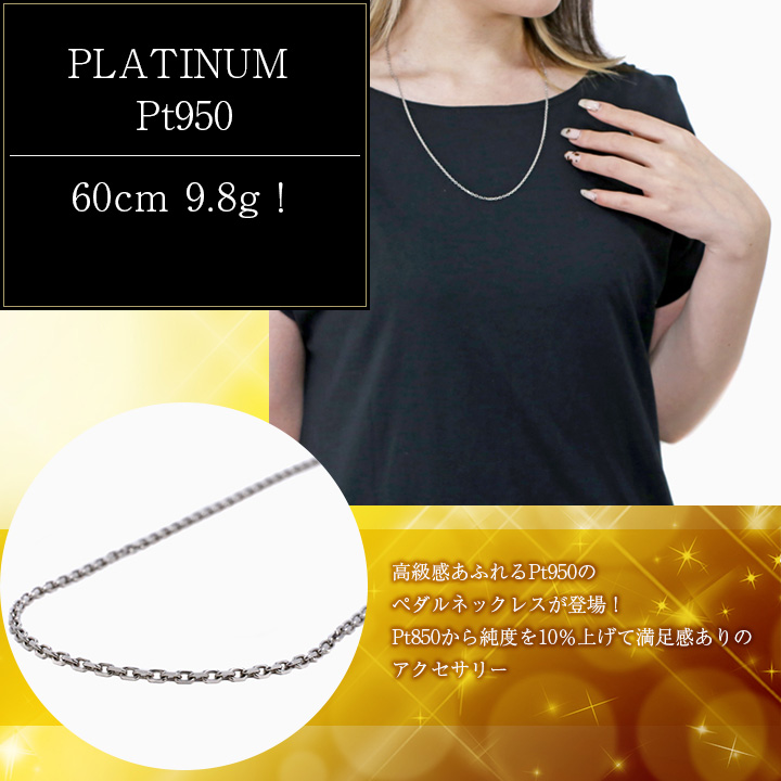 落着きのある色合いのプラチナ850 の純度を10%上げた高級素材 Pt950 を使ったチェーン。純プラチナほど柔らかくなく通常の850に比べより満足感のあり気品あふれるチェーン。デザインは男女に大人気の定番の4面カットを施したアズキチェーン。人とは違うちょっとオシャレなチェーンをお探しの方におススメの華やか過ぎない、洗練されたカットの美しい小豆ネックレス。1.8mm幅のボリューム感とずっしりの存在感の9.8gの満足感。お持ちの大きめのペンダントトップにも合わせやすく、普段の装いをぐっとエレガントに引き立ててくれます。60cmのゆったりサイズの男女兼用4面カットアズキチェーンは、着け心地も抜群です。プレート部分には、「Pt950(刻印)」が有り、素材の純度が証明されています。表と裏に各2面のカットを加えた合計4面カットをほどこしたデザインが輝く多面を作り胸元を豪華に演出。