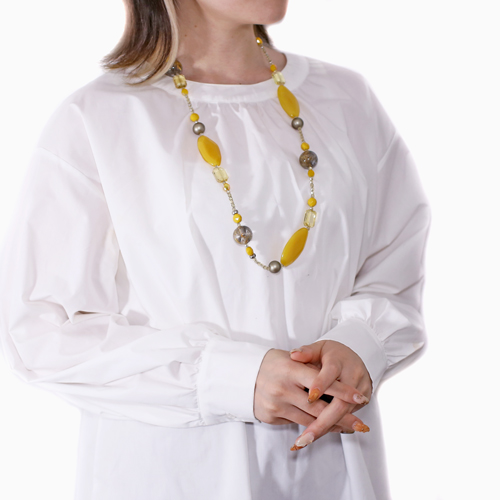 イタリアの最先端ファッションの都「ミラノ」。そこで活躍するジュエリーデザイナーのアヴェ・テッタマンティ。ベニスの熟練職人によるベネチアンガラスを使い洗練されたデザインセンスとイタリア人ならではの色使いを持ち合わせ、イタリアはもちろん世界中の大人の女性たちを魅了しています。彼女の作品は決して派手すぎずそれでいて絶対的な存在感があり、どんな服装にもコーディネートしやすいように考えられています。どんな服装にも合わせやすい絶妙なイエローブラウンの色合いとシェイプ。ベネチアンガラス、合金、樹脂を絶妙なバランスで使い、ボリューム感と軽い着け心地を実現。長さは留具を外さずに頭からかぶれる約82cm。 これからの季節、プレゼントにもぴったりです。※数量限定の商品ですので、売り切れの際はご了承ください。
