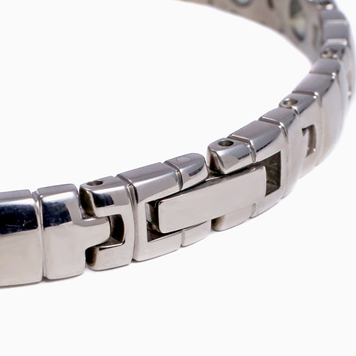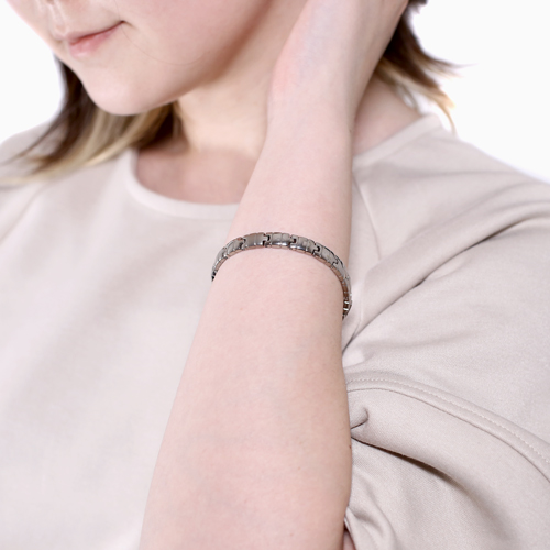 高純度素材である、純チタン(TITANIUM)はアルミニウムと同程度に軽く丈夫でさびにくく金属アレルギーをほとんど起こすことがなく紫外線に当たると表面に活性酸素ができて細菌を死滅させてしまう効果があると言われています。そのチタンを使いおしゃれなデザインブレスレット。裏面には純度99.99%のゲルマニウムをたっぷりと12個入れた仕様。肌の敏感な方や金属アレルギーが心配の方にも安心。また、男女を問わず楽しんでいただける洗練されたデザインです。長さ約18cmの標準サイズは、ぴたっと程よい感じです。「カラダにやさしい!!」これだけのボリュームがあるのに、着けているのを感じさせないほど軽いのがうれしいです。