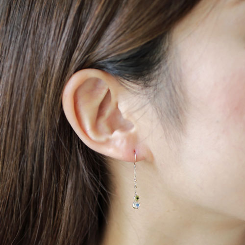 | サイズ | 長さ:32mm(ポスト部分込)24mm(チェーン部分) ぺリドット幅:3.5mm、ブルームーンストーン幅:4.5mm ミラーボール幅:1.5mm×1mm |