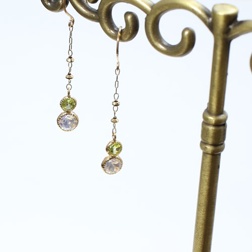透明感のあるぺリドットと乳白色のムーンストーンの石を使い、石枠をミル打ちにすることで上品でアンティークな印象に仕上げました。
