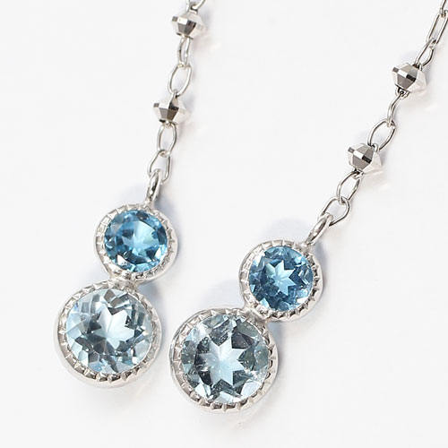 透明感のあるブルートパーズとスカイブルートパーズの石を使い、石枠をミル打ちにすることで上品でアンティークな印象に仕上げました。チェーンの間にキラキラのミラーボールを入れることで程良い輝きを放ちます。淡いブルーの落ち着いた感じが気品溢れる女性の印象を与えてくれます。デイリーにはもちろん、パーティやニ次会の席にもおすすめです!大切な人へのプレゼントにも喜んでいただける逸品です。