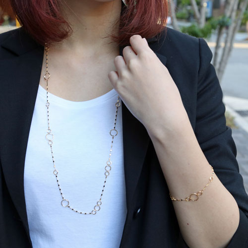 そのままでも存在感のあるキラキラとした上品なブレスレットですが、セットで80cmのロングネックレスと合わせれば、よりオシャレ感が倍増します。