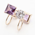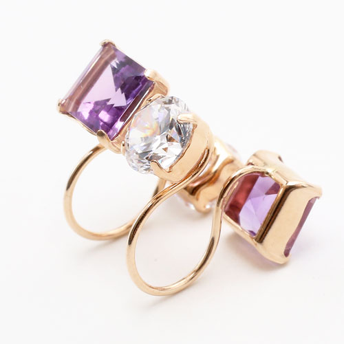 天然石のアメジストとキュービックジルコニアのリバーシブルタイプ。ピアスをしているように見え、耳元でさりげなく煌めき、クラス感のあるコーディネートに。
