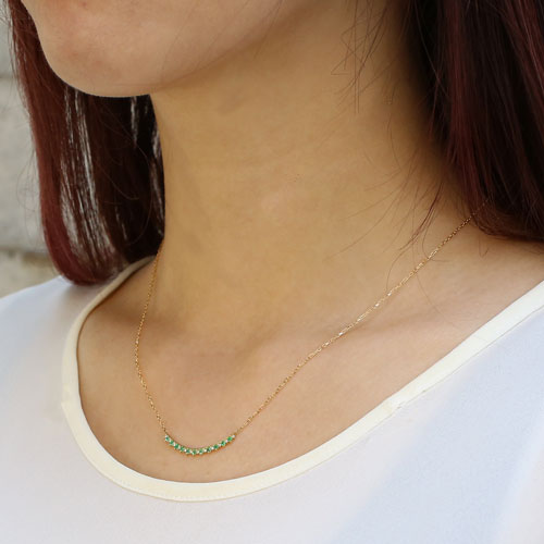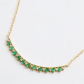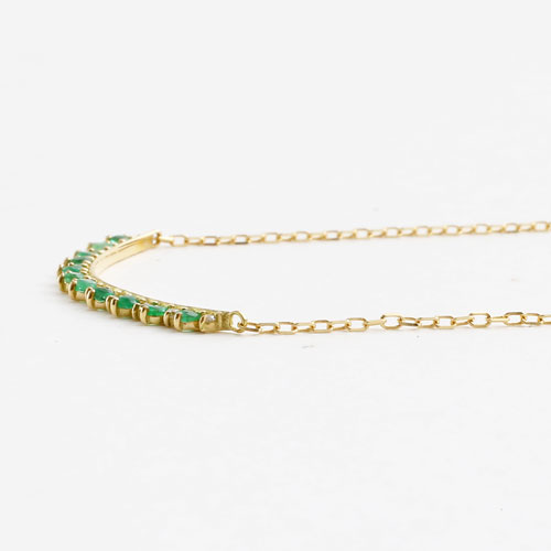 透き通るような綺麗なグリーン色の天然石エメラルド11石とダイヤモンド12石を交互に並べた18金素材のペンダントネックレスが登場しました☆ 天然石が施されたトップ部分は、肌に馴染みやすいようカーブの形でデザインされ、胸元を美しく演出してくれます♪