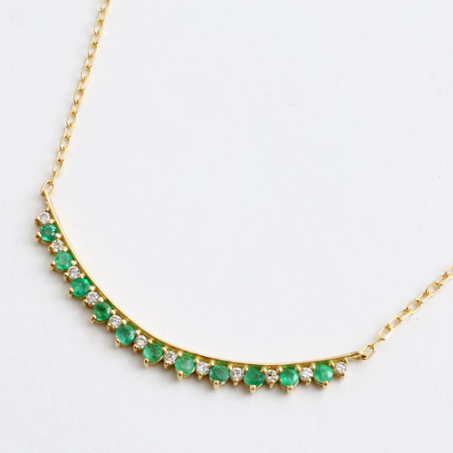 透き通るような綺麗なグリーン色の天然石エメラルド11石とダイヤモンド12石を交互に並べた18金素材のペンダントネックレスが登場しました☆ 天然石が施されたトップ部分は、肌に馴染みやすいようカーブの形でデザインされ、胸元を美しく演出してくれます♪そのままシンプルにお使い頂いても、別のチェーンやペンダントと合わせて重ねづけしてボリューミーにしても◎ 小さめで華奢だけれども、存在感は抜群です!!どんなスタイルにも合わせやすいので、パーティーシーンやフォーマル、カジュアルスタイルまで、 普段づかいのジュエリーとしても大活躍すること間違い無し♪ 流行や年齢に関係なく、きっと長く大事にお使い頂けます。5月の誕生石でも知られるエメラルドの石の意味には、幸運・幸福・夫婦愛・安定・希望とされ、自然と希望の象徴だそうです。 エネルギーや幸福感を生み出し、人々を若々しく美しく保つと言われています。お好きなケースも選べ、プレゼント包装も無料で対応しておりますので、大切な方への贈り物にもおすすめです♪