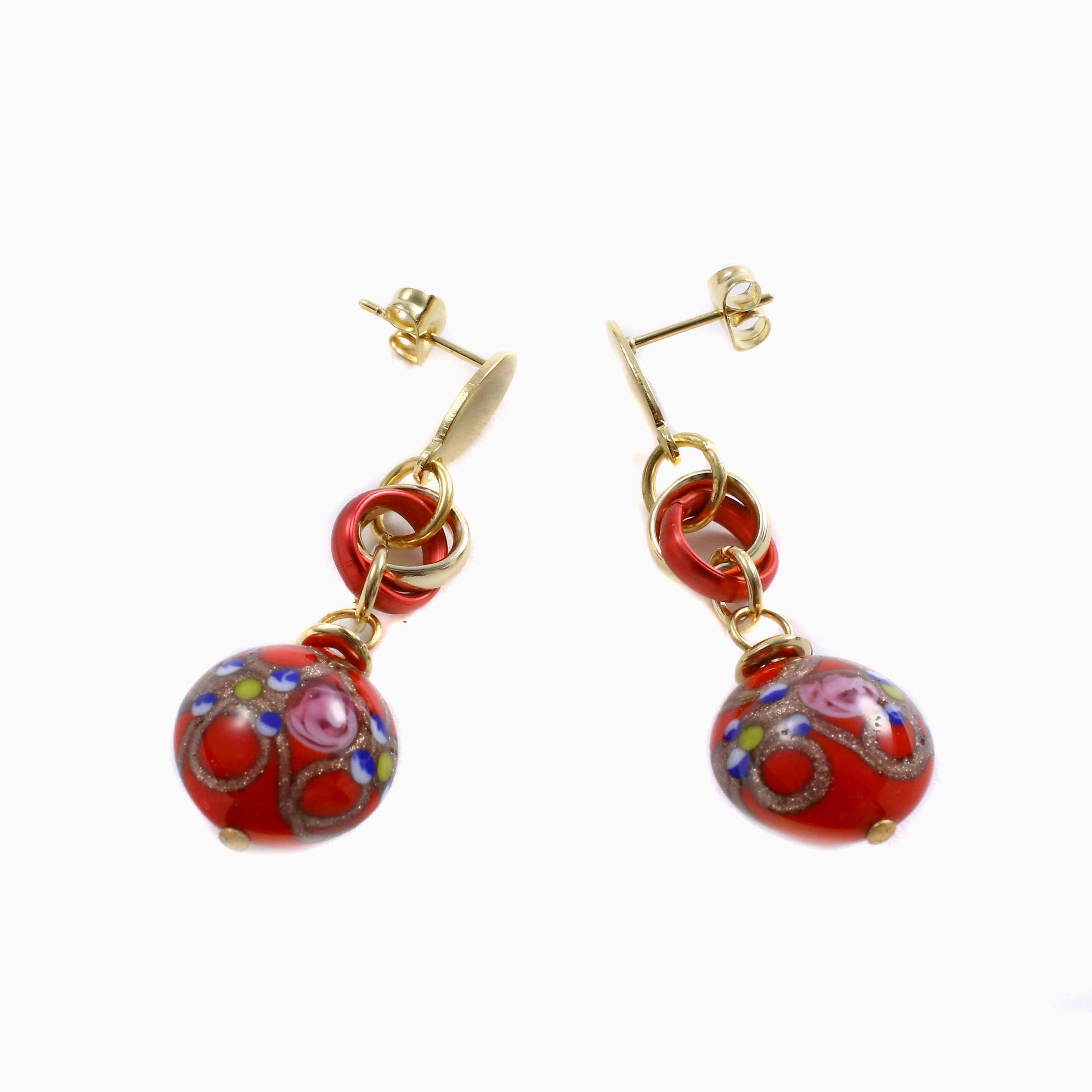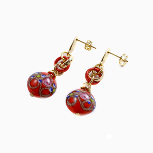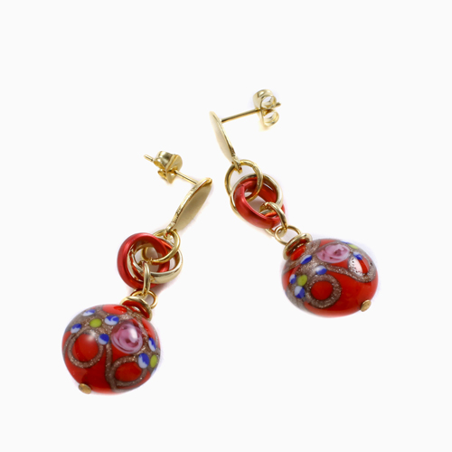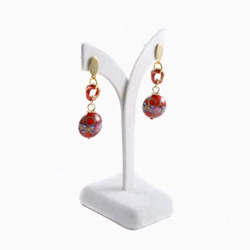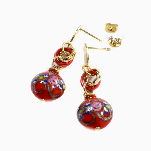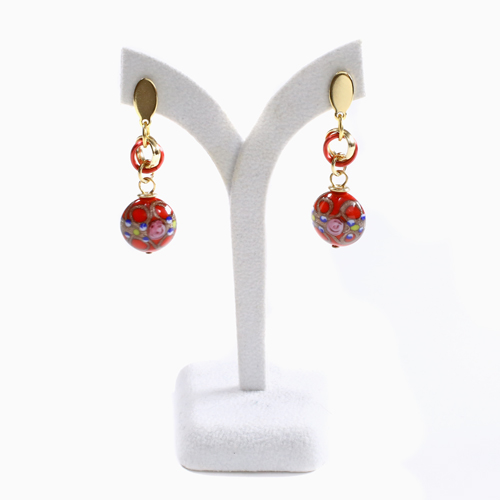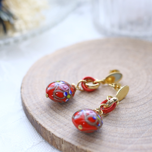 そのベネチアンビーズガラスを使って、ミラノで人気の若手アクセサリーデザイナー・キアラ(CHIARA)がおしゃれでわくわくする感性のピアスを作りました。レッド系の色を配した落ち着いた大人の色使いは日本の女性に気軽に着けてもらえるように考えたそうです。