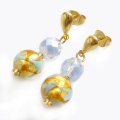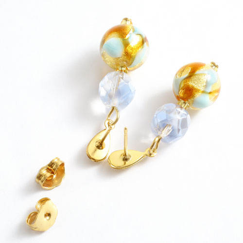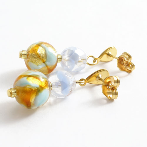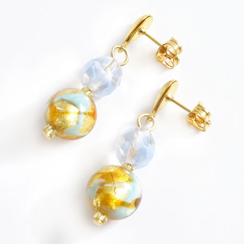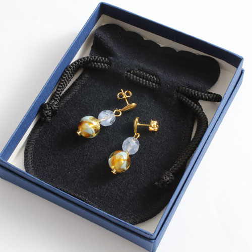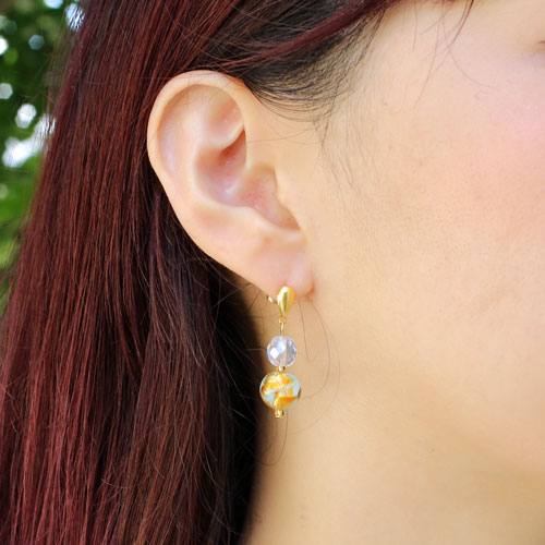 そのベネチアンビーズガラスを使って、ミラノで人気の若手アクセサリーデザイナー・キアラ(CHIARA)がおしゃれでわくわくする感性のピアスを作りました。ブルー・ゴールド系の色を配した落ち着いた大人の色使いは日本の女性に気軽に着けてもらえるように考えたそうです。