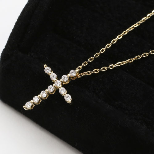 イタリア3大貴金属ジュエリー生産地の一つ、ヴェニスより西に約1時間のヴィチェンツァにある大手工場の商品。世界中に輸出をするイタリアンジュエリーは繊細で洗練されたデザインが特徴です。【どんな服装にも合わせやすいイエローゴールド定番クロス】表面にキュービックを11石配し、華やかさをアピール。裏面はイエローゴールドの地金が清楚な上品さを胸元に演出します。チェーンは人気の角アズキをセットしており、ゆったりサイズの43cmとアジャスターにより40cmにも調整ができます。