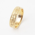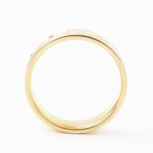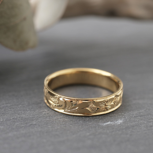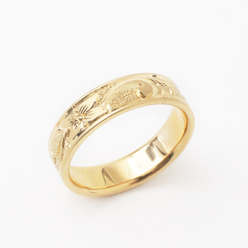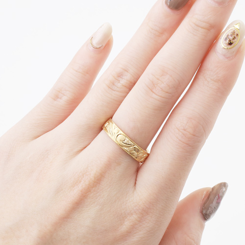 18金の5mm幅の平打リングに熟練職人が手彫りを施した圧巻の仕上げのリング。