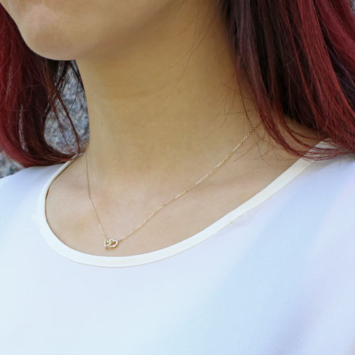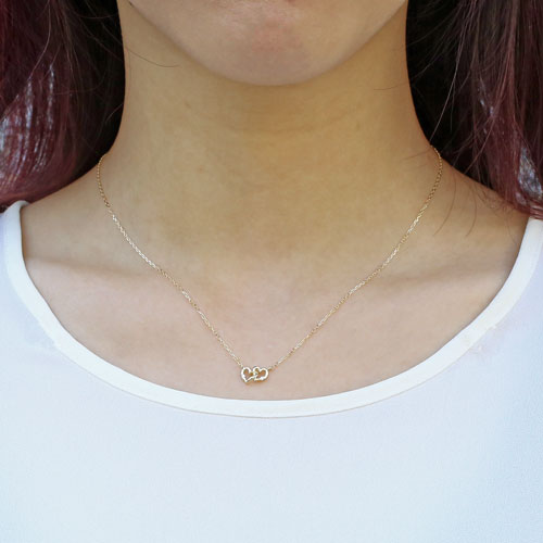 ダイヤモンド(0.02ct)を使用したハートモチーフの可愛いプチペンダントが登場しました☆ チェーンの素材にもダイヤモンドとの相性も抜群な10金イエローゴールドを使用!小さめで華奢だけれども主張し過ぎない存在感!そのままシンプルにお使い頂いても、別のチェーンやペンダントと合わせて重ねづけしてもOK! どんなスタイルにも合わせやすいので、普段づかいのジュエリーとしても大活躍すること間違い無し♪きらきらと輝くダイヤモンドにイエローゴールドの上品な色合いで大人っぽく、そしてトップのダブルハートで可愛らしく♪