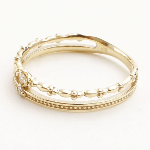 10金(K10)きらきら輝く上品なジュエリー!2連デザインの中心に0.01ctのダイヤモンド2石を使用した上品なリング。華奢なフォルムが指を細く長くみせてくれます。とても軽く着け心地も抜群!流行りや年齢に関係なく長くお使い頂けます!自分へのご褒美やプレゼントにもお勧めです。イエローゴールド本来の高級感あふれる光沢と相乗効果が魅力のリング。重ね着けアレンジ次第でいろんな表情が楽しめる、毎日のお洒落に大活躍すること間違いなしのリングです!